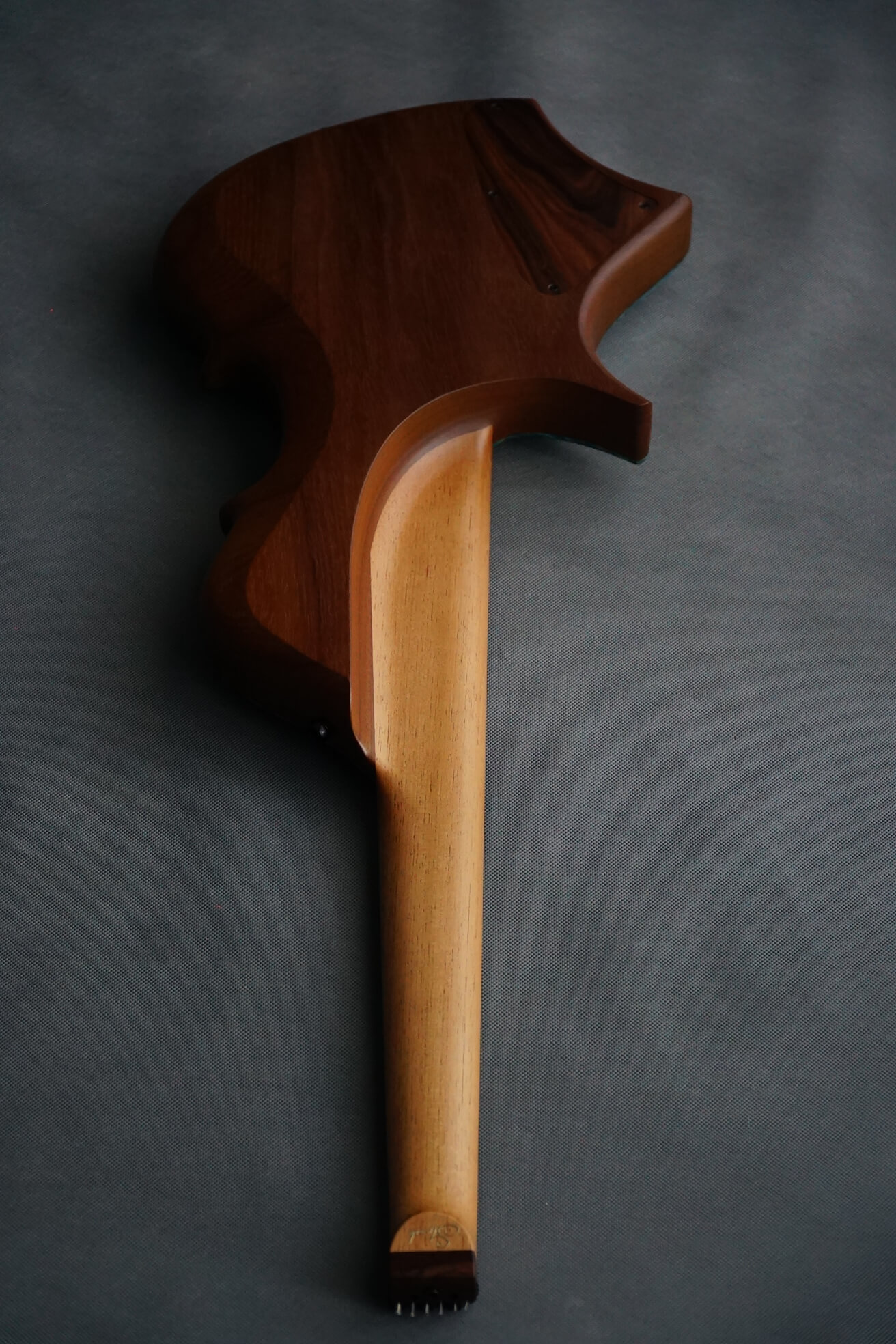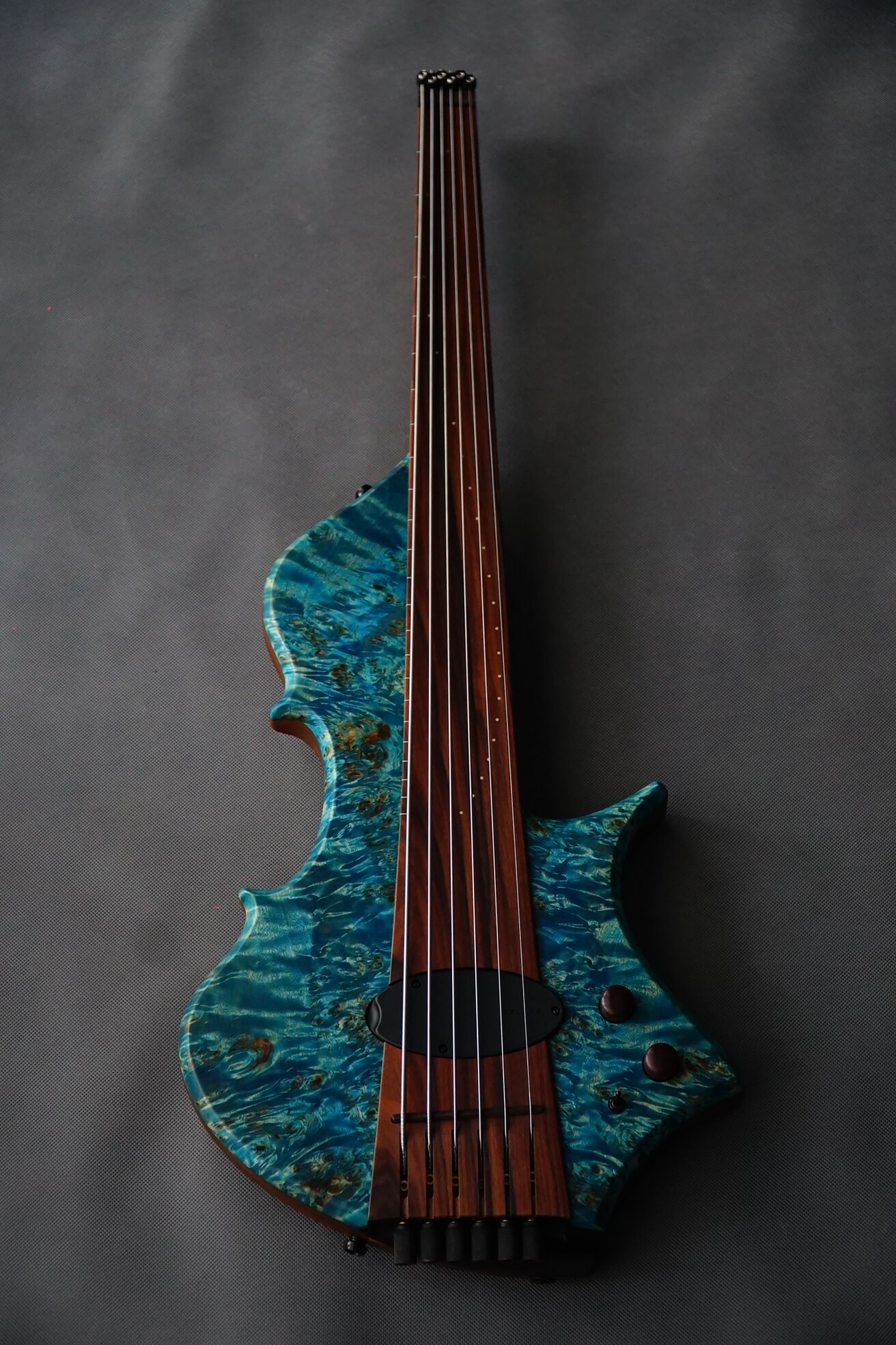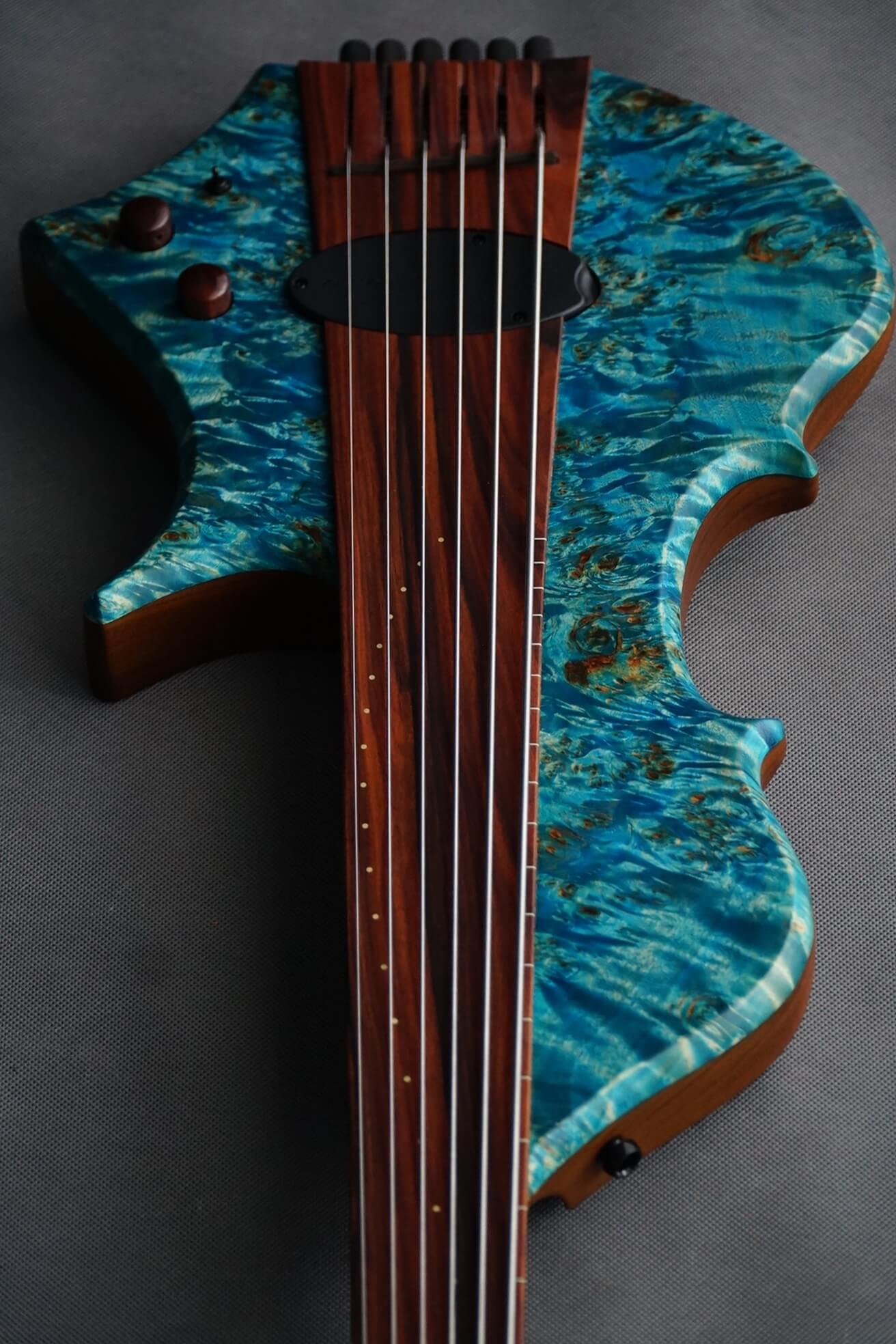 A true departure from the standard, this custom 30″ scale 6-string bass combines innovation and artistry in every detail. Crafted with a lightweight roasted samba chambered body, complemented by a local poplar burl top, it delivers a rich, resonant sound with an unmistakable visual allure. The pau ferro fingerboard, gracefully set on a Spanish cedar neck, offers smooth playability, while the carbon fiber tube and dual titanium truss rods ensure perfect stability, regardless of conditions.