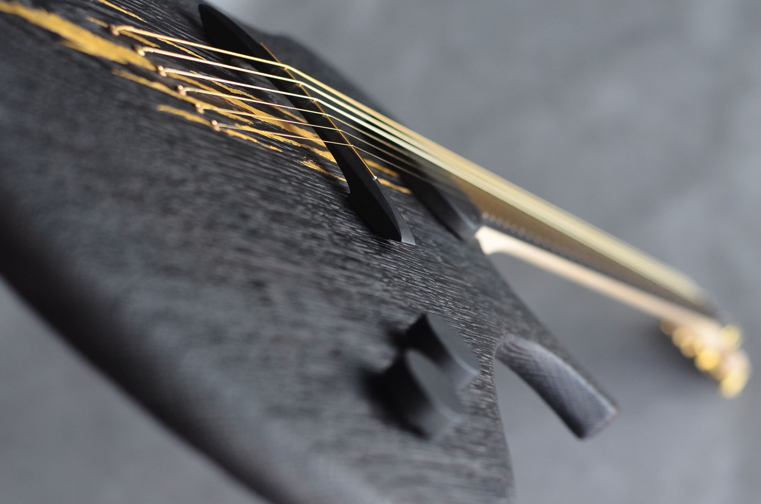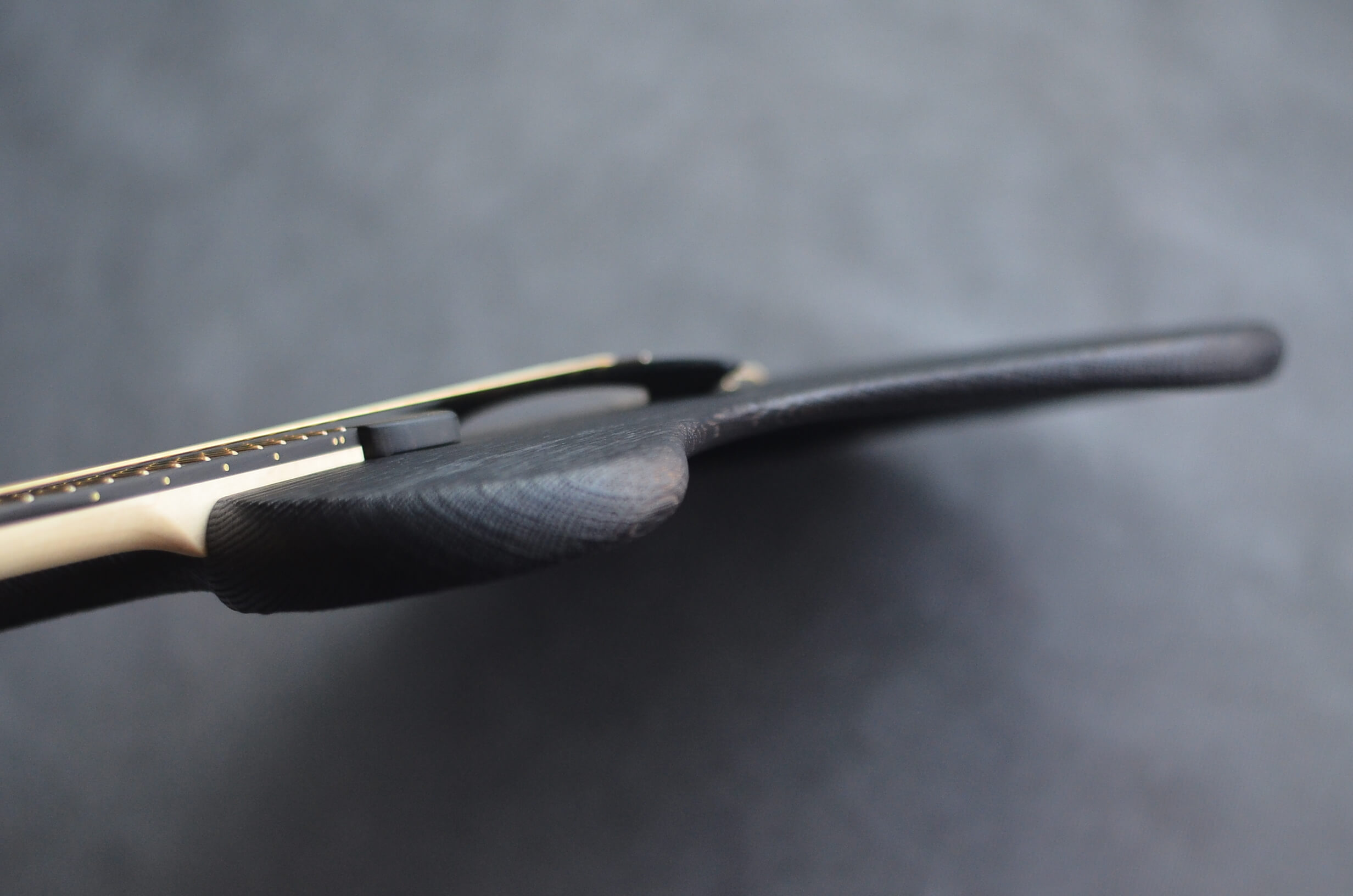The back plates, made from hand-hammered and patinated brass, add a striking contrast to the organic woodwork. Fire-finishing this delicate construction not only released tension in the wood but also created small cracks, which were filled with resin and adorned with 24k gold, drawing inspiration from the Japanese art of Kintsugi—celebrating imperfections as part of an object’s beauty. The neodymium pickup, crafted by Humless, is encased in a custom ebony housing, with its shape and the bridge design tailored specifically for this build. Together, these elements pay homage to the inspiring spirit of Japan, blending timeless craftsmanship with artistic innovation.